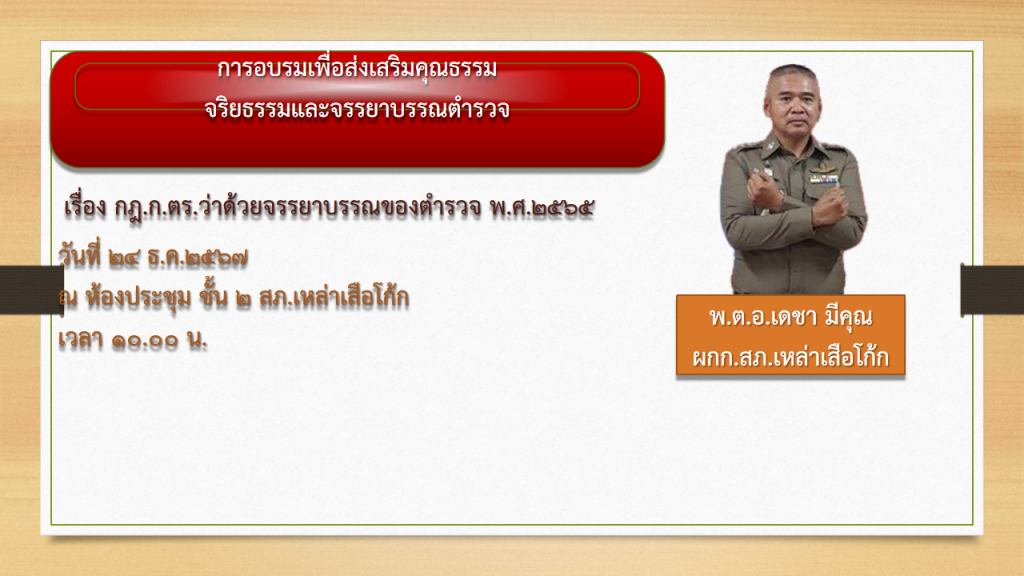 วันที่ 24 ธ.ค.67 เวลา 10.00 น. พ.ต.อ.เดชา มีคุณ ผกก.สภ.เหล่าเสือโก้ก จัดอบรมข้าราชการตำรวจในสังกัด สภ.เหล่าเสือโก้ก เรื่อง ข้าราชการตำรวจพึงปฏิบัติตน เพื่อรักษาจริยธรรม ในการประชุมประจำเดือนของหน่วย