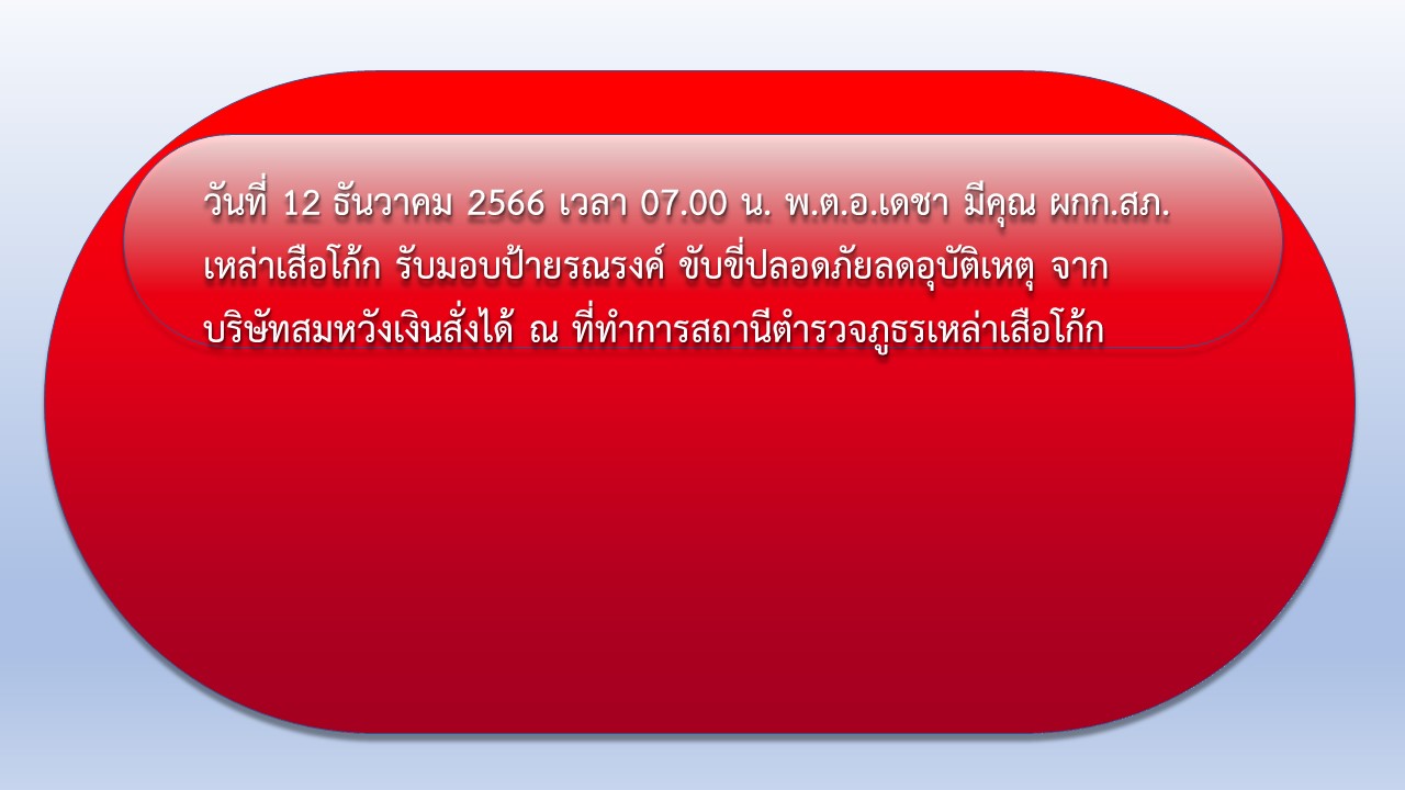 ข่าวกิจกรรม 13 ธันวาคม 2566 โดย admlaosueakok / ข่าวประชาสัมพันธ์,ข่าวกิจกรรม วันที่ 12 ธันวาคม 2566 เวลา 08.00 น. พ.ต.อ.เดชา มีคุณ ผกก.สภ.เหล่าเสือโก้ก รับมอบป้ายรณรงค์ขับขี่ปลอดภัย Facebook iconFacebookTwitter iconTwitterLINE iconLine