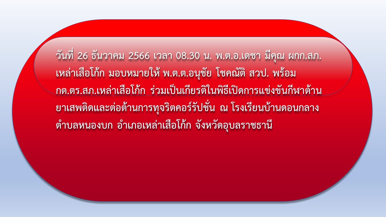 ข่าวกิจกรรม 27 ธันวาคม 2566 โดย admlaosueakok / ข่าวประชาสัมพันธ์,ข่าวกิจกรรม วันที่ 26 ธันวาคม 2566 เวลา 08.30 น. พ.ต.อ.เดชา มีคุณ ผกก.สภ.เหล่าเสือโก้ก มอบหมายให้ พ.ต.ต.อนุชัย โชคณัติ สวป., พร้อม กต.ตร.สภ.เหล่าเสือโก้ก ร่วมเป็นเกียรติเปิดกีฬาต้านยาเสพติดและต่อต้านการทุจริตคอร์รัปชั่น Facebook iconFacebookTwitter iconTwitterLINE iconLine