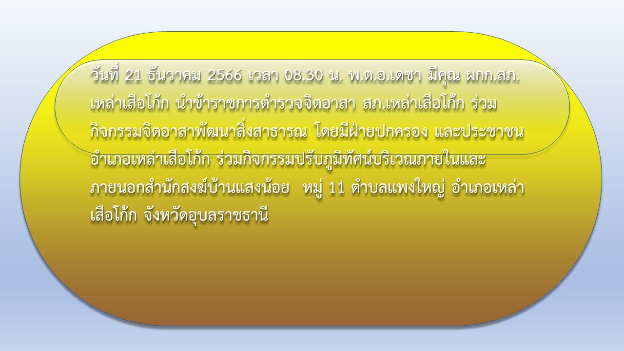 ข่าวประชาสัมพันธ์ 23 ธันวาคม 2566 โดย admlaosueakok / ข่าวประชาสัมพันธ์,ข่าวฝากประชาสัมพันธ์ วันที่ 21 ธันวาคม 2566 เวลา 08.30 น. พ.ต.อ.เดชา มีคุณ ผกก.สภ.เหล่าเสือโก้ก นำข้าราชการตำรวจจิตอาสา สภ.เหล่าเสือโก้ก ร่วมกิจกรรมจิตอาสาพัฒนาสิ่งสาธารณประโยชน์ Facebook iconFacebookTwitter iconTwitterLINE iconLine