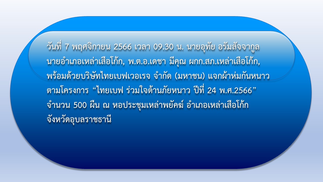 ข่าวภารกิจผู้บังคับบัญชา 03 15 กันยายน 2565 โดย admlaosueakok / ข่าวภารกิจผู้บังคับบัญชา วันที่ 7 พฤศจิกายน 2566 เวลา 09.30 น. นายอุทัย อรัมสัจจากูล นายอำเภอเหล่าเสือโก้ก, พ.ต.อ.เดชา มีคุณ ผกก.สภ.เหล่าเสือโก้ก ร่วมกิจกรรมโครงการ "ไทยเบฟ ร่วมใจต้านภัยหนาว" Facebook iconFacebookTwitter iconTwitterLINE iconLine
