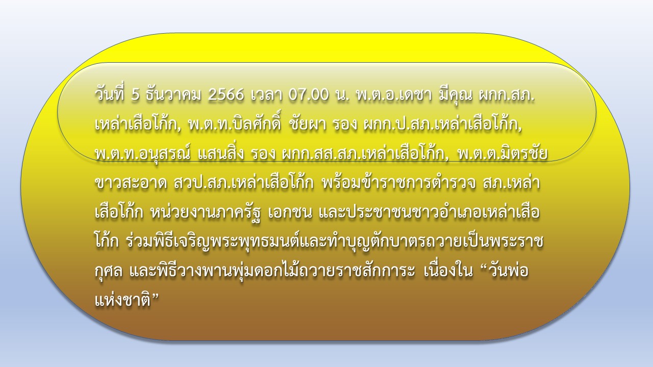 Elementor #1965 9 ธันวาคม 2566 โดย admlaosueakok / ข่าวภารกิจผู้บังคับบัญชา วันที่ 5 ธันวาคม 2566 เวลา 07.00 น. พ.ต.อ.เดชา มีคุณ ผกก.สภ.เหล่าเสือโก้ก พร้อมข้าราชการตำรวจ สภ.เหล่าเสือโก้ก ร่วมกิจกรรม เนื่องในวันชาติ วันพ่อแห่งชาติ Facebook iconFacebookTwitter iconTwitterLINE iconLine
