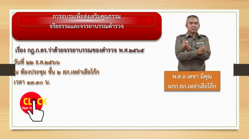 ข่าวกิจกรรมที่ 2 การมีส่วนร่วมของหัวหน้าสถานี จัดอบรมข้อการปฏิบัติตนของข้าราชการตำรวจเพื่อรักษา จริยธรรม และจรรยาบรรณของตำรวจ